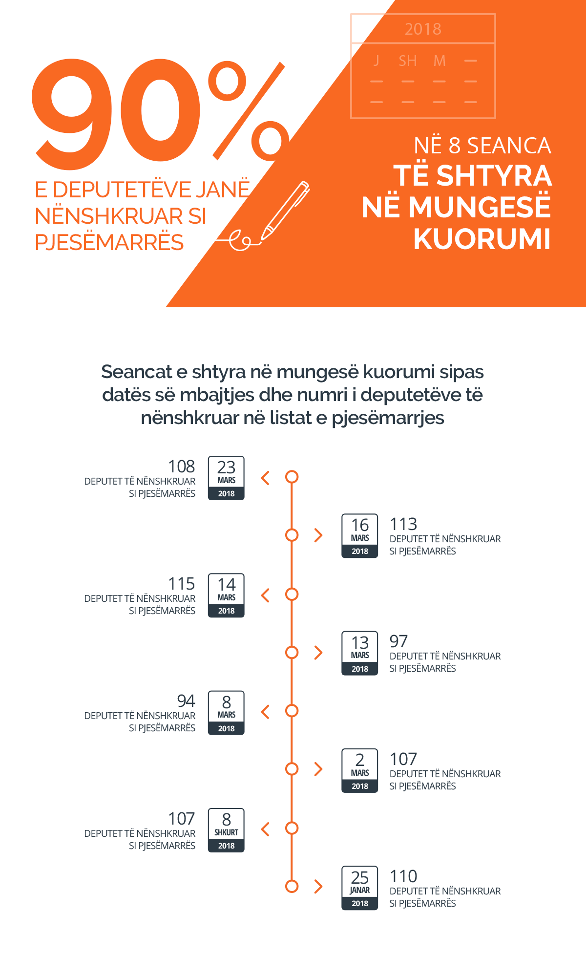 Në legjislaturën e VI –të Kuvendi i Kosovës është përballur vazhdimisht me mungesë të kuorumit, mirëpo kjo problematikë është theksuar më shumë gjatë vitit 2018.Për periudhën janar – mars të këtij viti nga tetë seanca sa ka mbajtur Kuvendi, të gjitha janë shtyrë për mungesë kuorumi. Këto seanca janë përcjellë me vazhdime madje deri në katër herë. Ndonëse në listat e pjesëmarrjes të seancave të mbajtura për këtë periudhë kohore janë nënshkruar 90% e deputetëve, një numër i konsiderueshëm i tyre nuk kanë qëndruar në sallë deri në përfundim të seancës. Për rrjedhojë votimi i pikave të rendit të ditës në ditën kur është paraparë ka qenë i pamundur për shkak të mosprezencës së deputetëve.