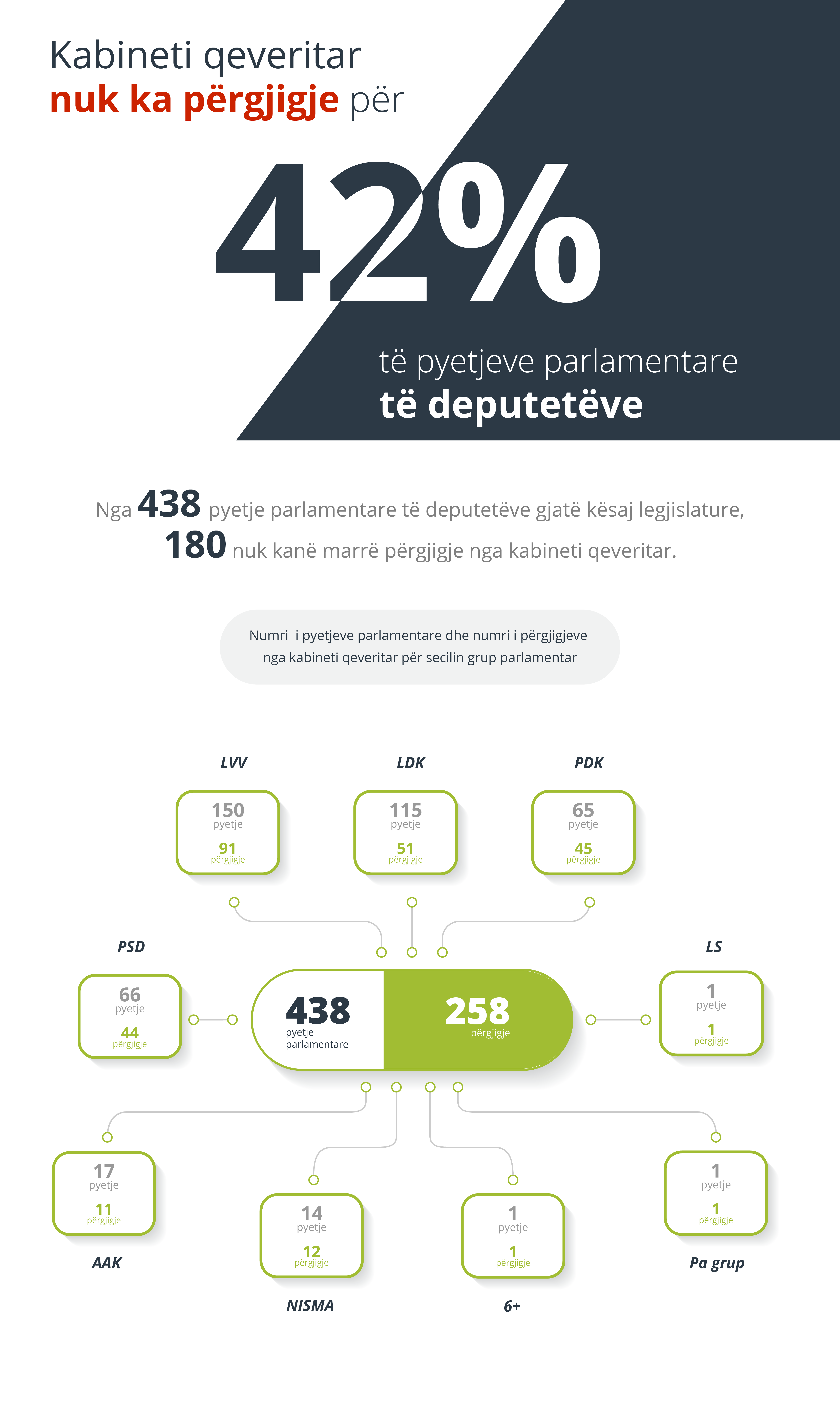 Që nga fillimi i kësaj legjislature e deri më tani numri i përgjithshëm i pyetjeve parlamentare të parashtruara nga deputetët është 438, ku 58% e të cilave kanë marrë përgjigje nga kabineti qeveritar. Ndërkaq janë edhe 180 pyetje të cilat nuk nuk kanë marrë përgjigje nga kabineti qeveritar ose 42% e pyetjeve të parashtruara.
